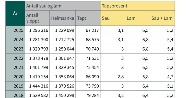 Tabellen under synar utviklinga for sau og lam sleppt på utmarksbeite dei siste åtte åra.