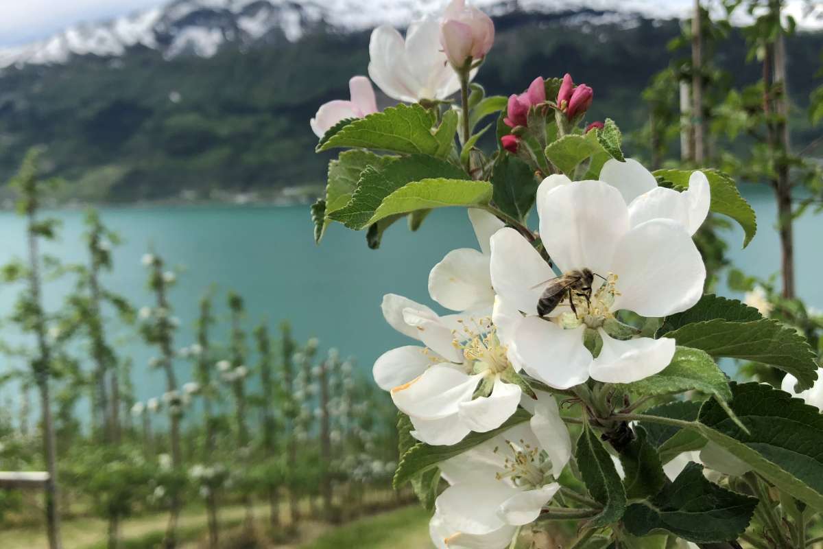 I år stod frukttrærne i Midt-Telemark i full blomst en liten uke senere enn i fjor. Det gir mindre bekymring for frostnetter og kalde perioder. Foto: Ragnar Våga Pedersen