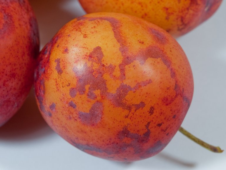 - Sorten ‘Victoria’ viser imidlertid tydelige fruktsymptomer med ring- og linjestrukturer og innsenkninger på fruktene, mens bladsymptomene er svært svake. Fruktsymptomer fører til dårlig utviklede frukter som kan falle av. Fruktkjøttet får brun - brunrød misfarging og nekrotiske områder. Også på steinen kan en finne flekker og ringstrukturer. Sorten ‘Reeves’ gir også tydelige fruktsymptomer.