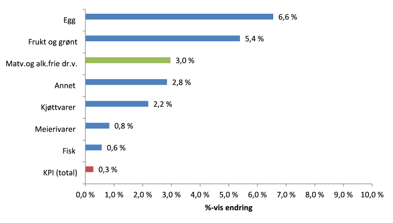 Samtlige hovedgrupper av mat har hatt en øking i prisene den siste måneden. Prisen på egg økte mest med 6,6 prosent. Årsaken til den store økingen skyldes en priskorreksjon fra forrige måned, da prisen på egg ble satt ekstra mye ned som følge av «lokketilbud». Også prisen på frukt og grønt økte en del denne måneden. Det er ikke uvanlig at prisen på frukt og grønt øker en god del i april og mai måned, så denne økningen var forventet. For øvrige matvarer var det også forventet en liten økning da prisene gikk ned i forrige måned. Figuren nedenfor viser siste måneds prisutvikling for hovedgrupper av mat, på KPI (totalt) og indeksen for mat- og alkoholfrie drikkevarer.