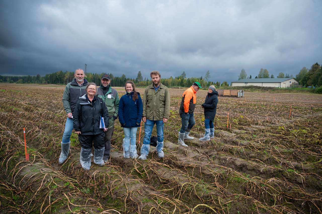 Markdag om vekstavslutning i potet på tampen av en utfordrende potetsesong. Fra venstre: Johan Rud (HF Maskin Teknikk AS), Kirsten Tørresen (NIBIO), Anders Nordlund, feltvert, Camilla Bye og Øystein Skagestad (NLR Øst). Bak: Fagkoordinator i potet Borghild Glorvigen (NLR) i ivrig dialog med en potetdyrker. Foto: Erling Fløistad