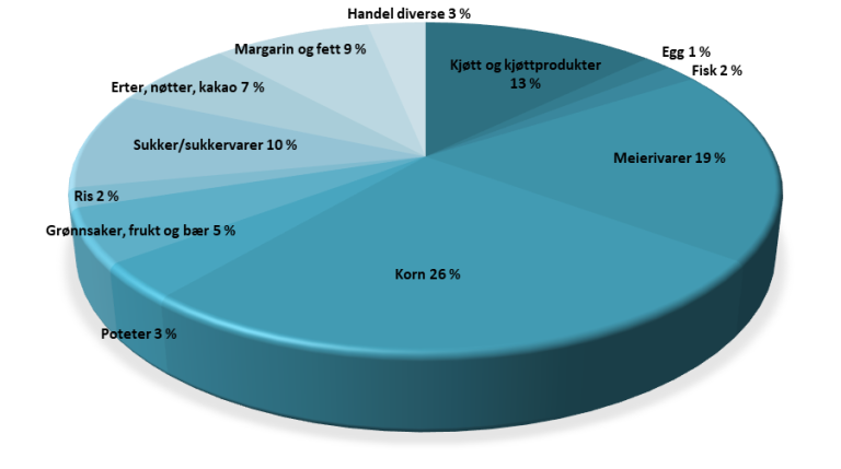 Tala vert oppgjevne i kilo og i energi. Dei to reknemåtane gjev størst skilnad for frukt og grønt. Reknar ein i kilo, utgjorde frukt og grønt ein fjerdedel av det me åt i gjennomsnitt i 2023. Reknar ein i energi vart det berre 5 prosent. Tolv eller tretten prosent av kosthaldet bestod av kjøt og berre to eller tre prosent av fisk, alt etter om ein reknar i vekt eller energi. Me er ganske sjølvforsynte med produkt frå husdyrhald, mindre sjølvforsynte med korn, grønsaker, frukt og bær.