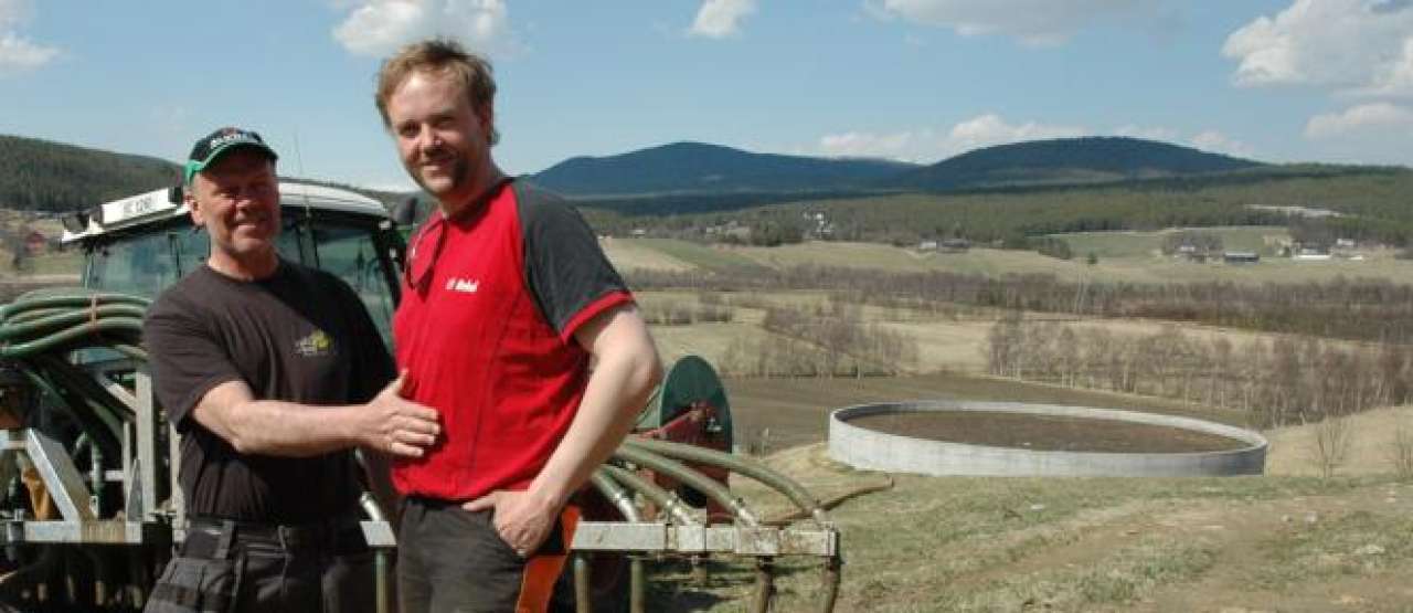 Bonde Gudmund Tronsmoen (t.v.) er fornøyd med at Erik Gjelten Dystebakken satser på slangespredning og har slanket utstyret med 15 tonn. Foto: Jon Schärer.