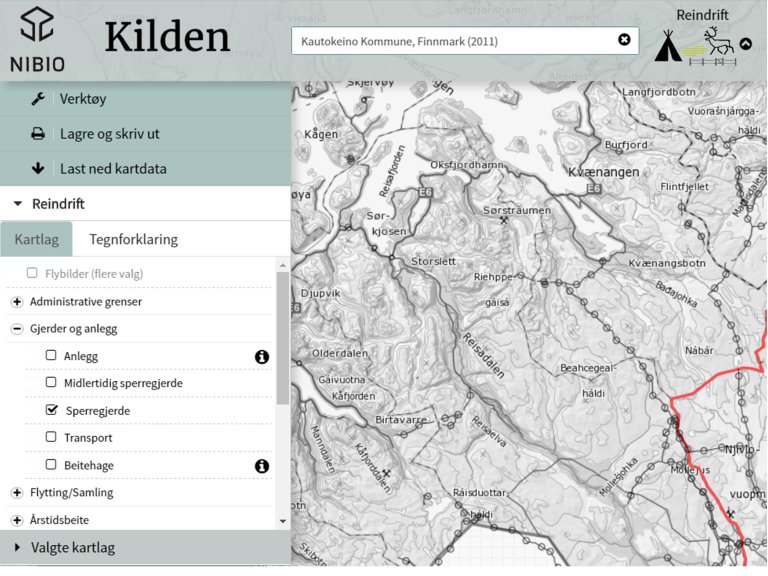 NIBIO har ansvaret for driften av den digitale og åpent tilgjengelige kartløsningen Kilden (kilden.nibio.no). Kilden inneholder blant annet egne reindriftskart som gir innsyn i reindriftsnæringens arealbruk.