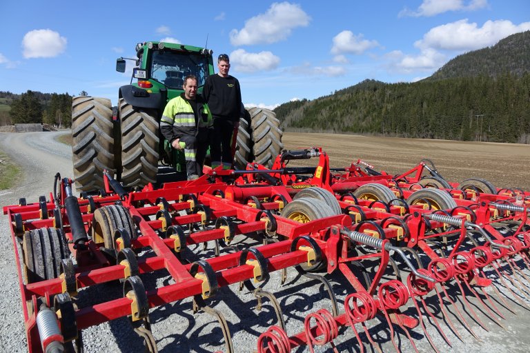 Med over to tusen dekar jord pluss leiekjøring er Kristian Loe og Terje Lilleås avhengig av ei effektiv våronn. For å unngå jordpakking er de veldig bevisste på både dekkutrusting, lufttrykk og kjøremønster. De driver eget maskinlag, og med 12 disponible traktorer, står det enkelte redskap påmontert hele våren. Tvillinghjul foran og bak på traktor som kjører harv, ekstra brede bakdekk på traktor med gjødselspreder/såmaskin. Til slutt kommer en gammel lettvekter, John Deere 1950, med åkertrommelen.