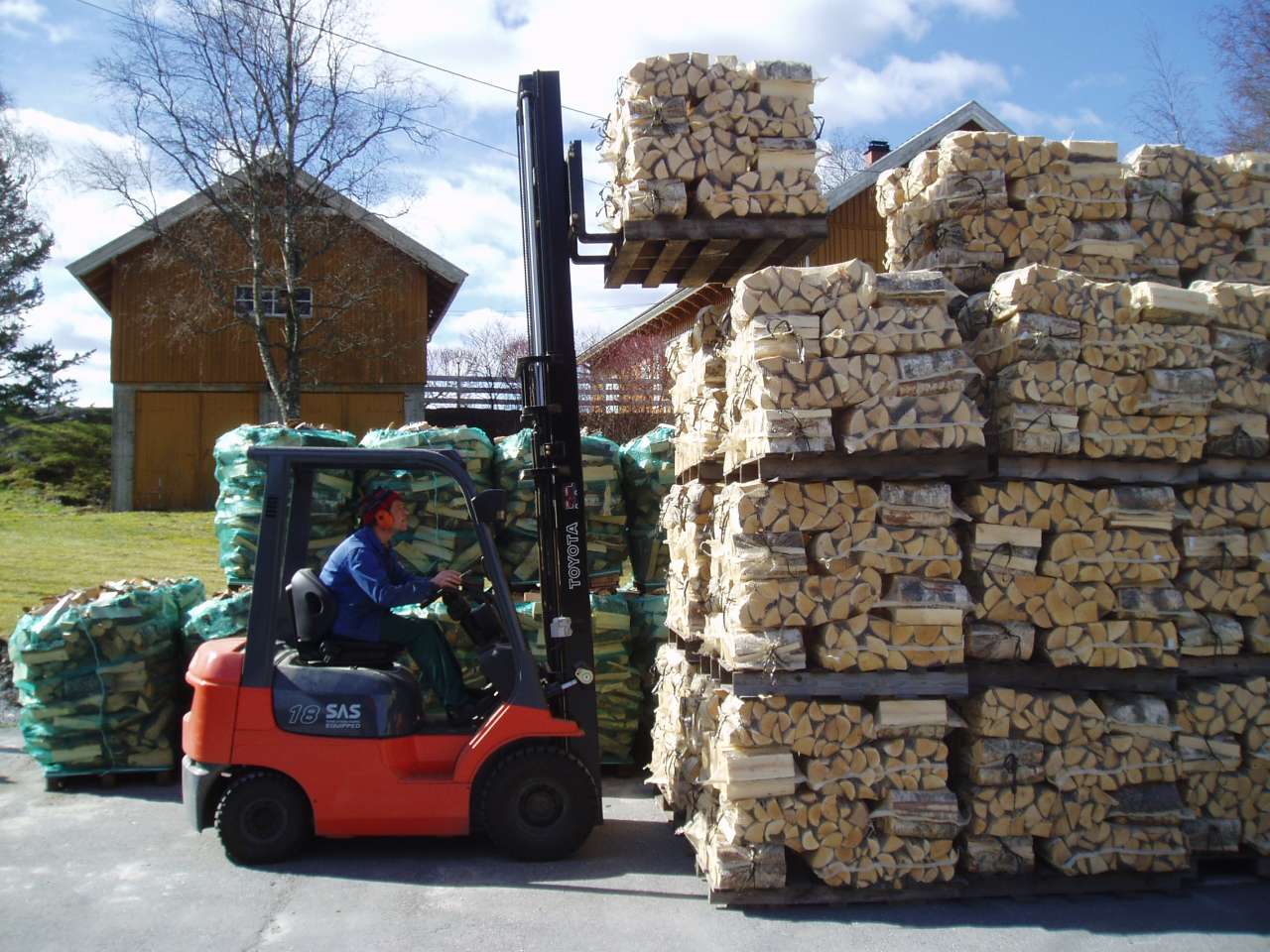 Stabling av vedsekker med truck. Foto: Leif Kjøstelsen, NIBIO.