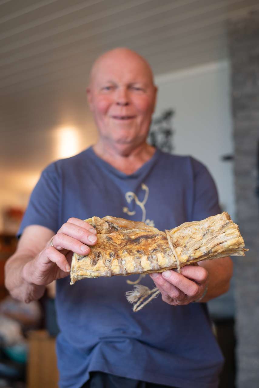 Helge Borgund fortel at ein kan sjå at dette er frå ein bukk fordi det er så mykje fett. Om dette hadde vore sau ville det vore kvitt og hardt, men dette er mjukt, og har så mykje smak at det er godt å ete sjølve feittet.