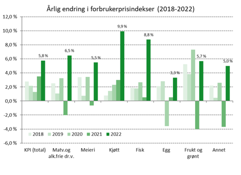 SSBs konsumprisindeks (KPI-12 måneders indeks) gikk opp med 5,9 prosent i 2022. Forbrukerprisindeksen på mat- og alkoholfrie drikkevarer gikk opp 11,5 prosent.