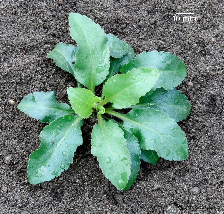 Det dannes etter hvert en bladrosett, med eggforma, sagtanna blad. Blada er fjærnerva med mange korte par sidenerver.