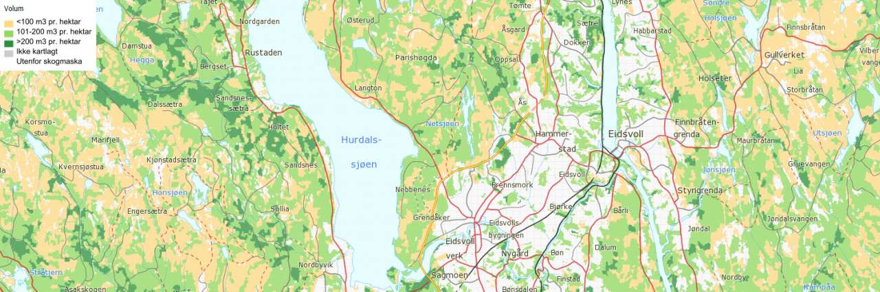 Volum er det totale volumet summert over alle treslagene (gran, furu, bjørk og andre lauvtreslag) på et areal.